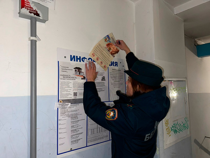 В завершение встреч вручают гражданам профилактические листовки и размещают противопожарные листовки на информационных стендах в жилых домах.