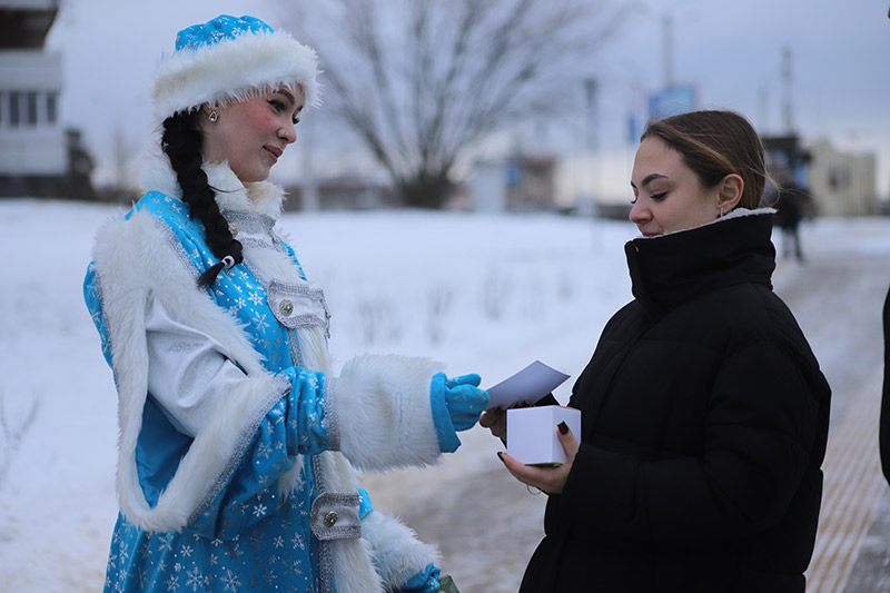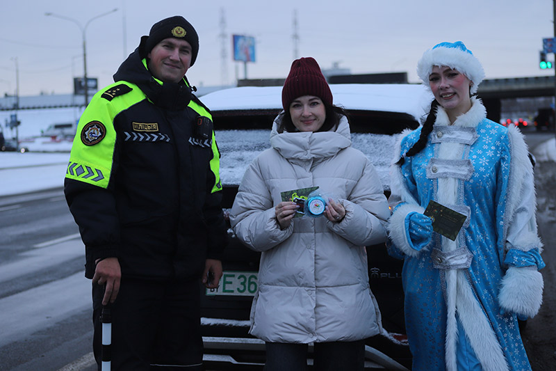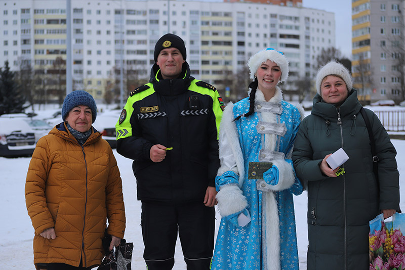 Не остались без внимания и пешеходы. Сказочная героиня и милиционеры вручали детям и взрослым световозвращающие элементы как символ безопасного года, напоминали о внимательности на зимних улицах и, конечно, желали счастья в новом году.