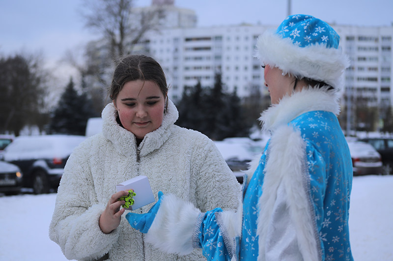 Не остались без внимания и пешеходы. Сказочная героиня и милиционеры вручали детям и взрослым световозвращающие элементы как символ безопасного года, напоминали о внимательности на зимних улицах и, конечно, желали счастья в новом году.