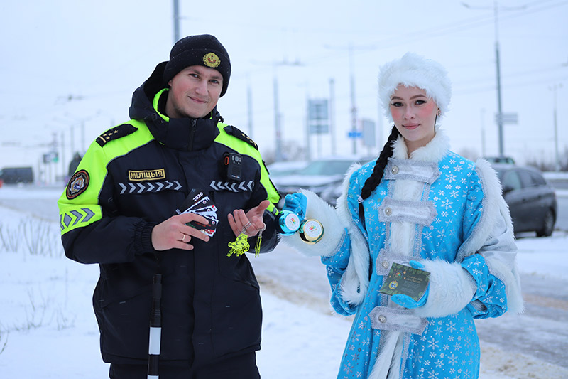 В последний день уходящего года на улицах Заводского района столицы можно было встретить необычный экипаж. К служебному автомобилю ГАИ присоединилась... настоящая Снегурочка! Так прошла совместная праздничная акция отдела ГАИ Заводского РУВД г. Минска и районной организации МООП «БРСМ».